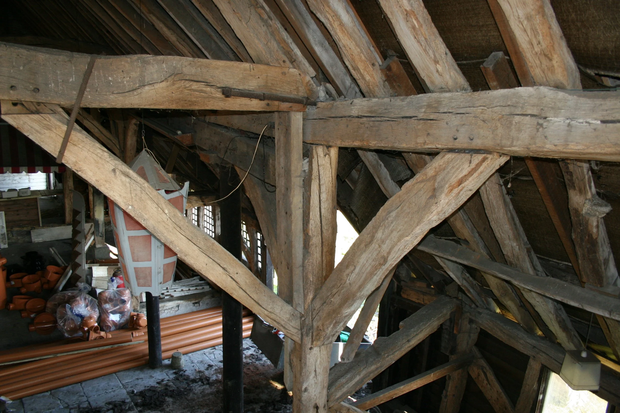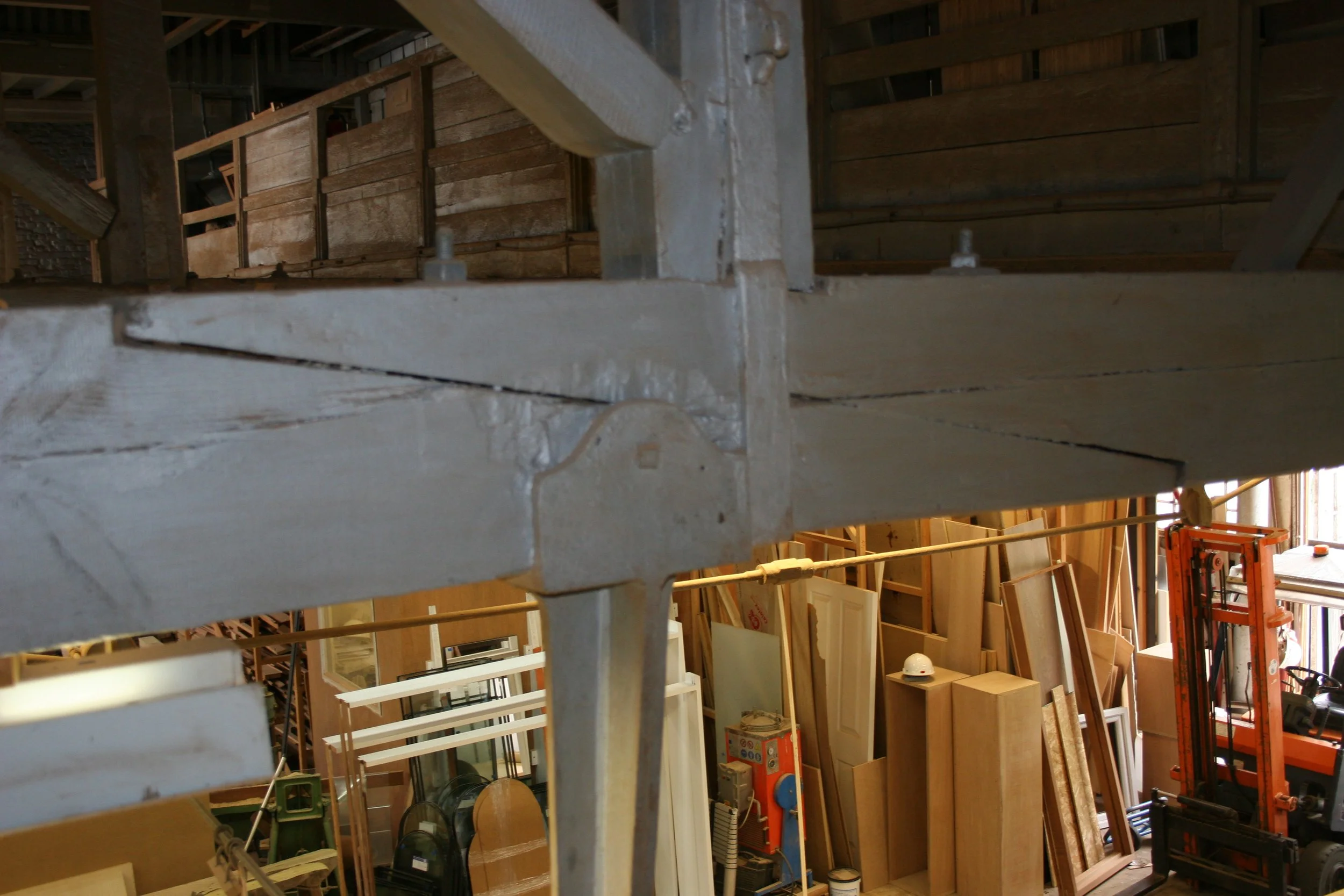 However it is very important to take each element and combine it in context. It is not enough to identify a ‘stop-splayed and tabled scarf with sallied and undersquinted butts, internal tongues and key’ and assign a date of the C13th to it because it appears in the Cressing Wheat Barn. Recently, when recording the roof timbers of Brunel’s Sawmill in Chatham, I recorded exactly the same joint knowing that it must date to after 1854 when the original roof of the 1814 building was damaged by fire. The same scenario played out in the roof of Canterbury Cathedral where most of the original timbers had been replaced in softwood after a fire.