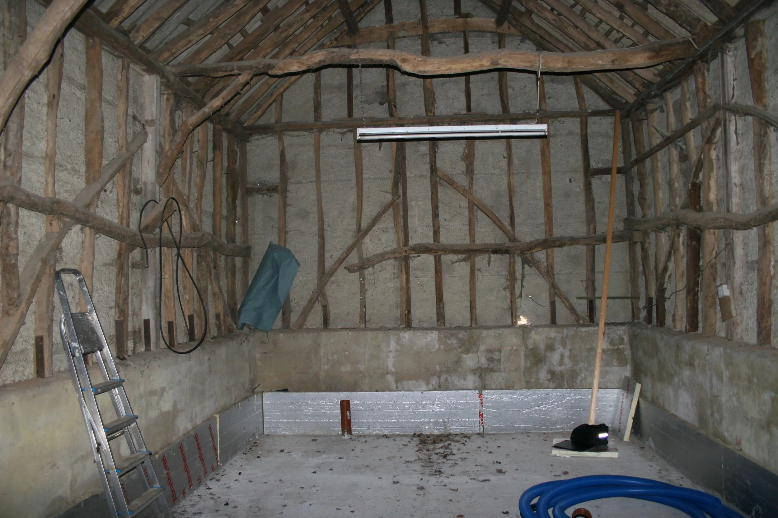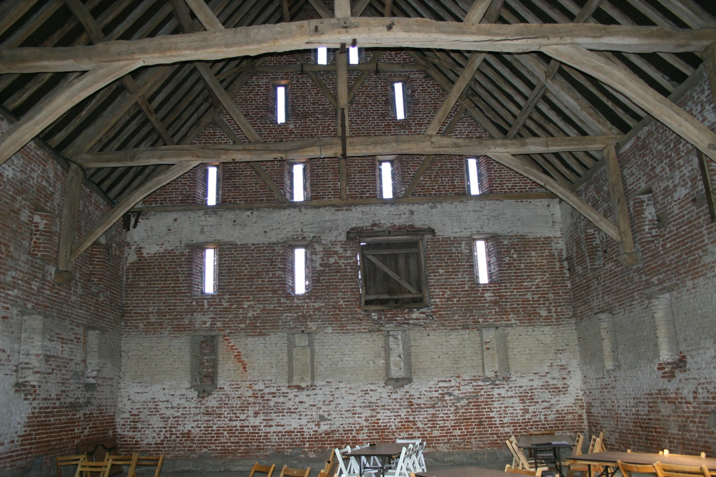 There is a tendency to think that barns were large, open buildings without internal divisions or floors but this is purely down to all the divisions being removed in the C20th to install modern machinery, in particular seed dressers and grain dryers. A classic example of this is the Barley Barn at Cressing Temple, built c.1206 but heavily modified throughout its life. The Barley Barn was divided off completely at each end by 12ft high weather-boarded stud walls and the aisles were fenced with gates to keep sheep. The divisions were photographed still in place by John Tarling in 1936.