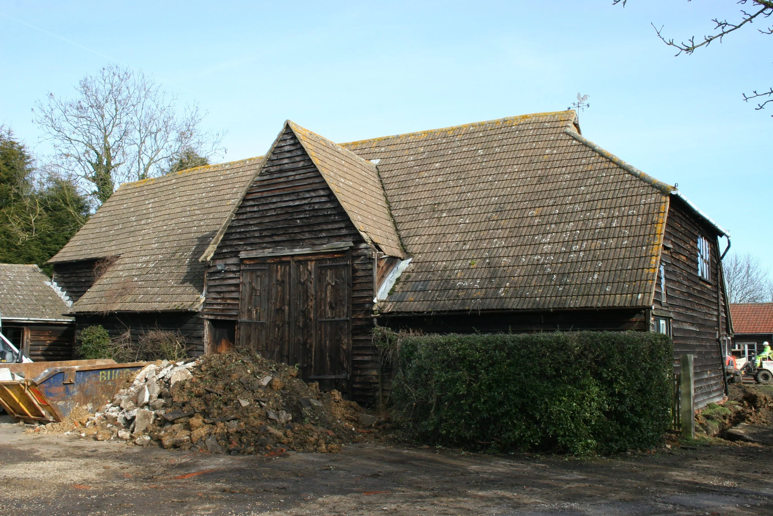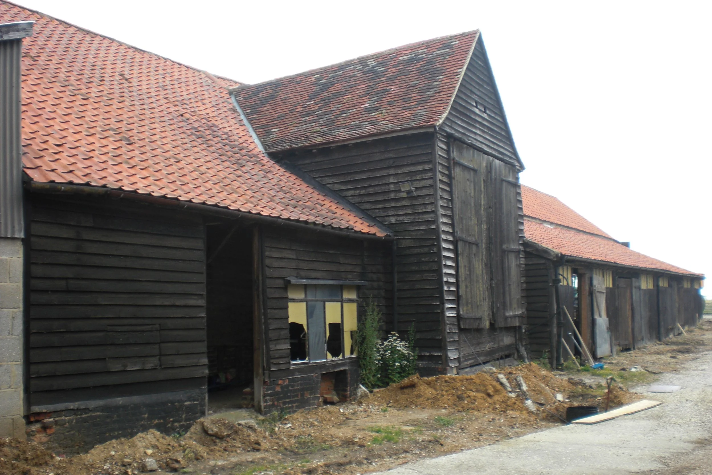 Most barns are dated in the Listings stylistically from their frames. However, in many cases the buildings have been dismantled, moved and rebuilt using the older frames but to suit the farming practices of C.1800. A classic example of this is the barn at Holyfield Farm, Crooked Mile, Waltham Abbey. Here the original C16th barn was taken down, moved and re-erected and connected to another frame. I was able to prove this in excavations where we uncovered the original footings, still containing stonework robbed out from Waltham Abbey itself.