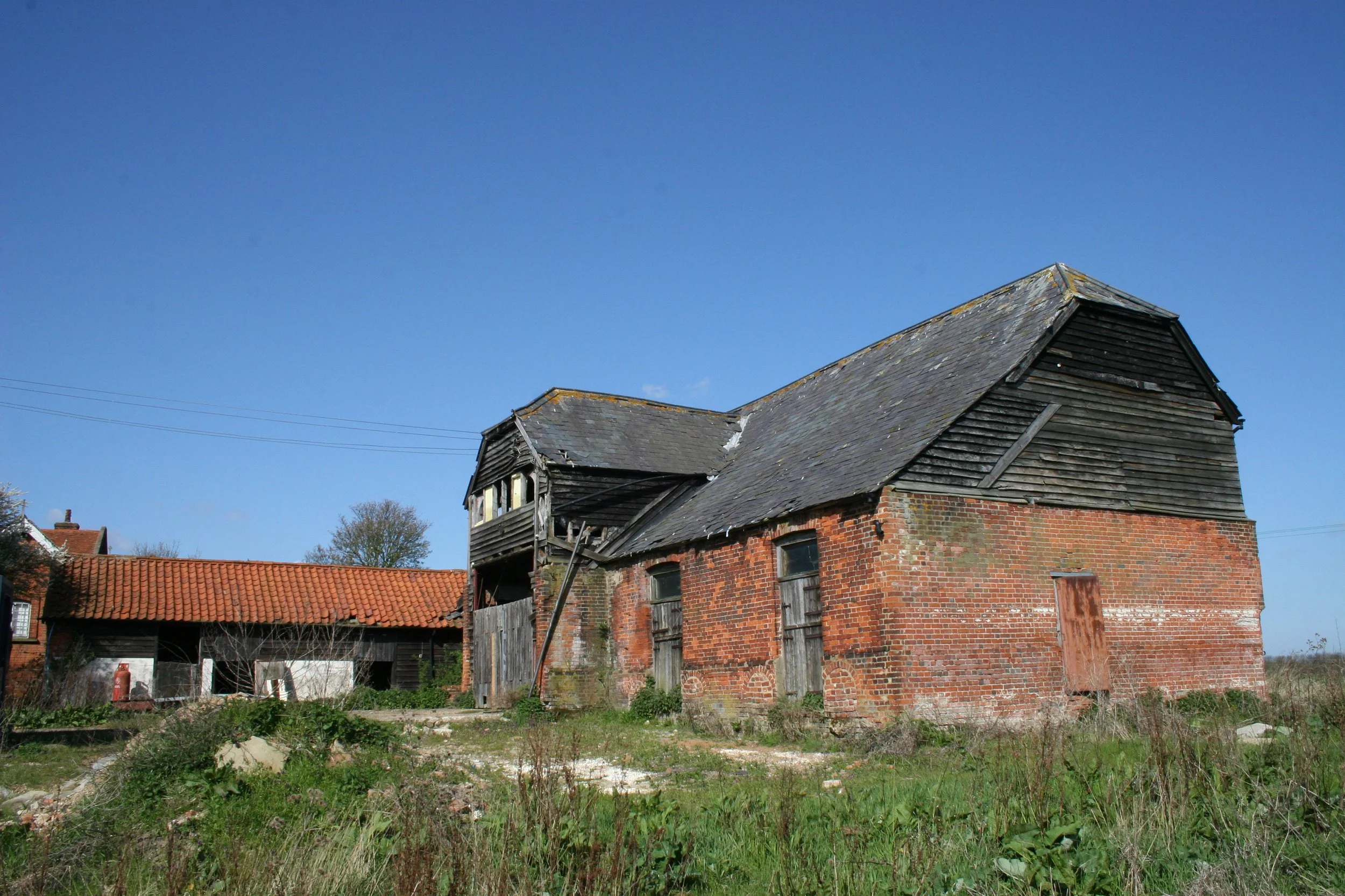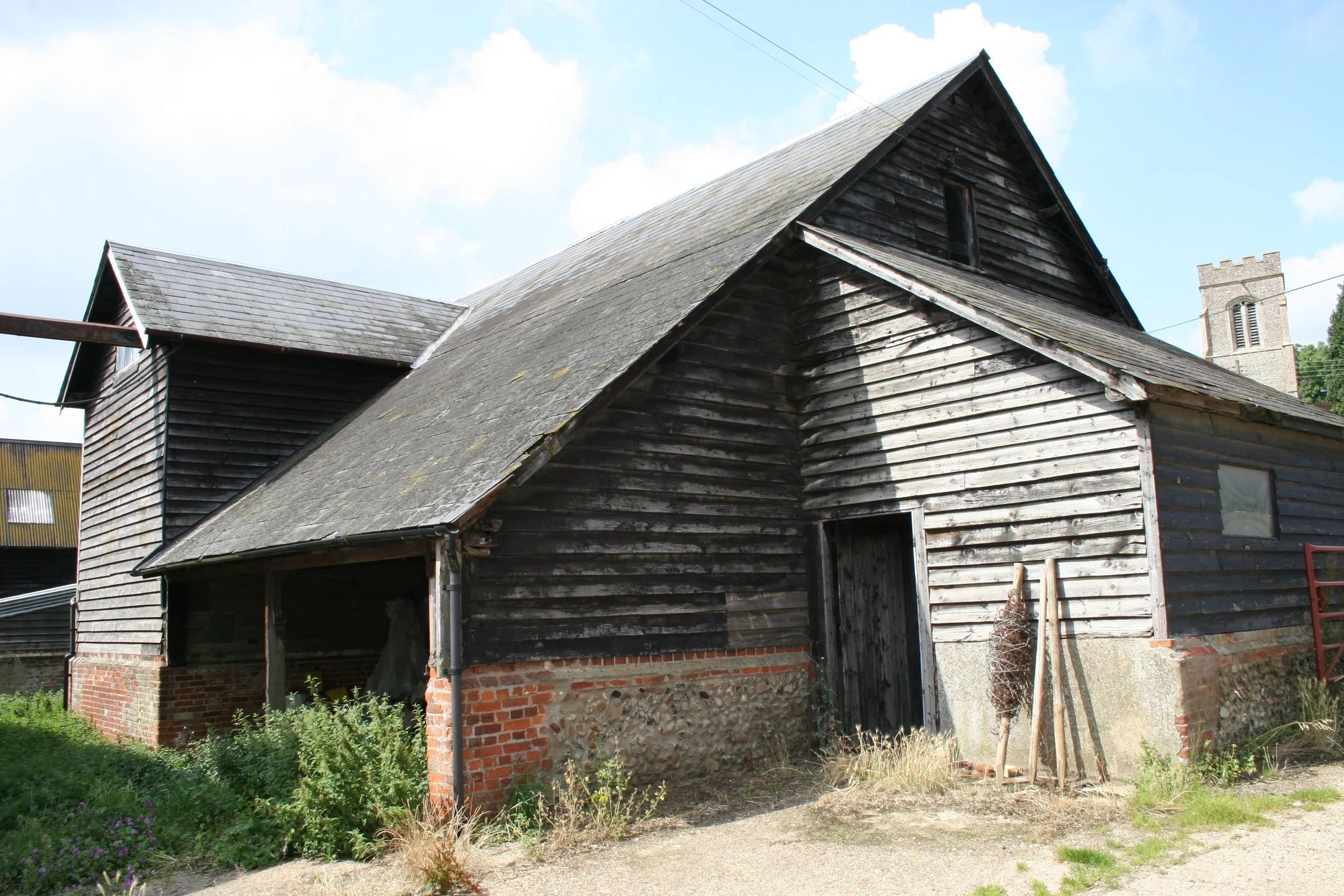 Barns are a specific type of agricultural building designed to store produce from the field prior to winnowing and gleaning. In East Anglia, they are nearly all timber-framed but there are C19th brick-built barns. Early barns have no porches and low doorways. As time progressed into the 15th century, porches were added so that wagons could be brought inside full and exit empty which is why so many barns have one very tall door and one lower. Many barns were used to thresh and winnow grain and, for this, they were designed to create a cross draught and had thresh-holds (also called leaps) to contain the processed grain.