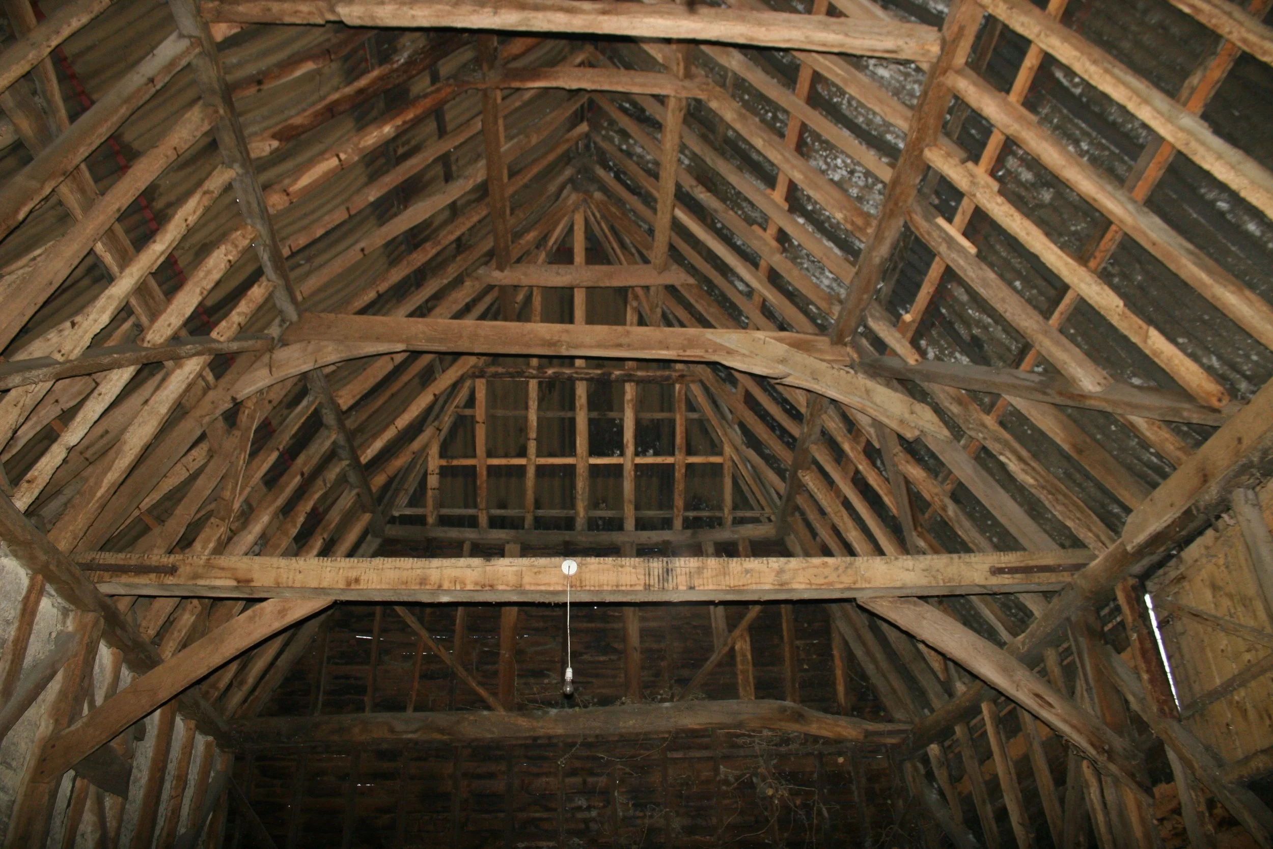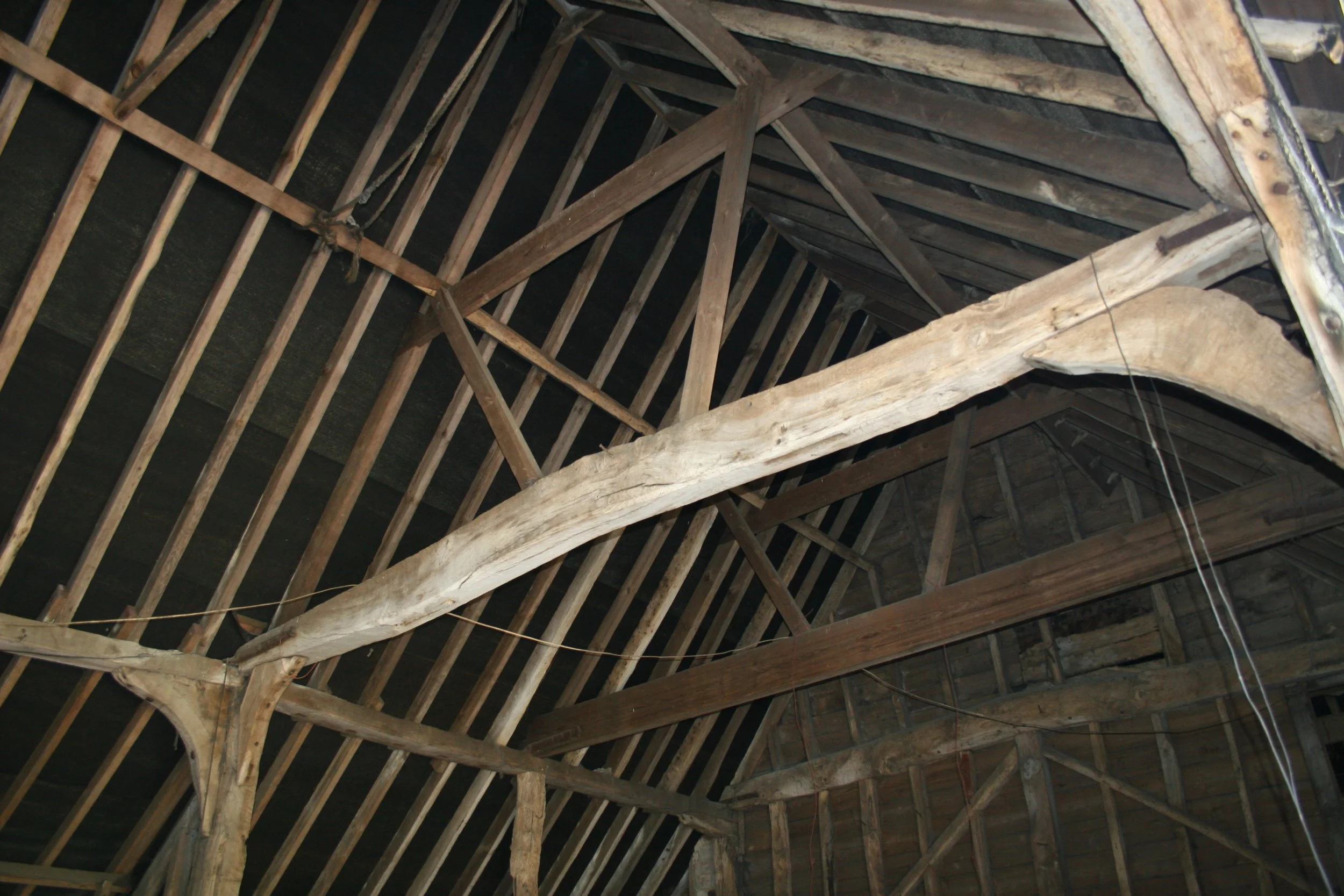 Characteristically, an early mediaeval barn (C13th onwards) will have storey or arcade posts that taper from bottom to top (i.e. the same way the tree grew) and have slender upstands in place of jowls. These often split off or twist out. The timbers will be of square section and straight. The mortices and tenons will have few pegs, two or three in the large timbers and only one in the studs. In very early barns like those at Cressing Temple, the walls were vertically boarded and the studs were very widely spaced. The trusses may be complex with passing braces, scissor braces and double tie-beams connected with cross-braces. The lap joints may have notches or secret notches. The scarf joints will usually be splayed, complex and ornate.