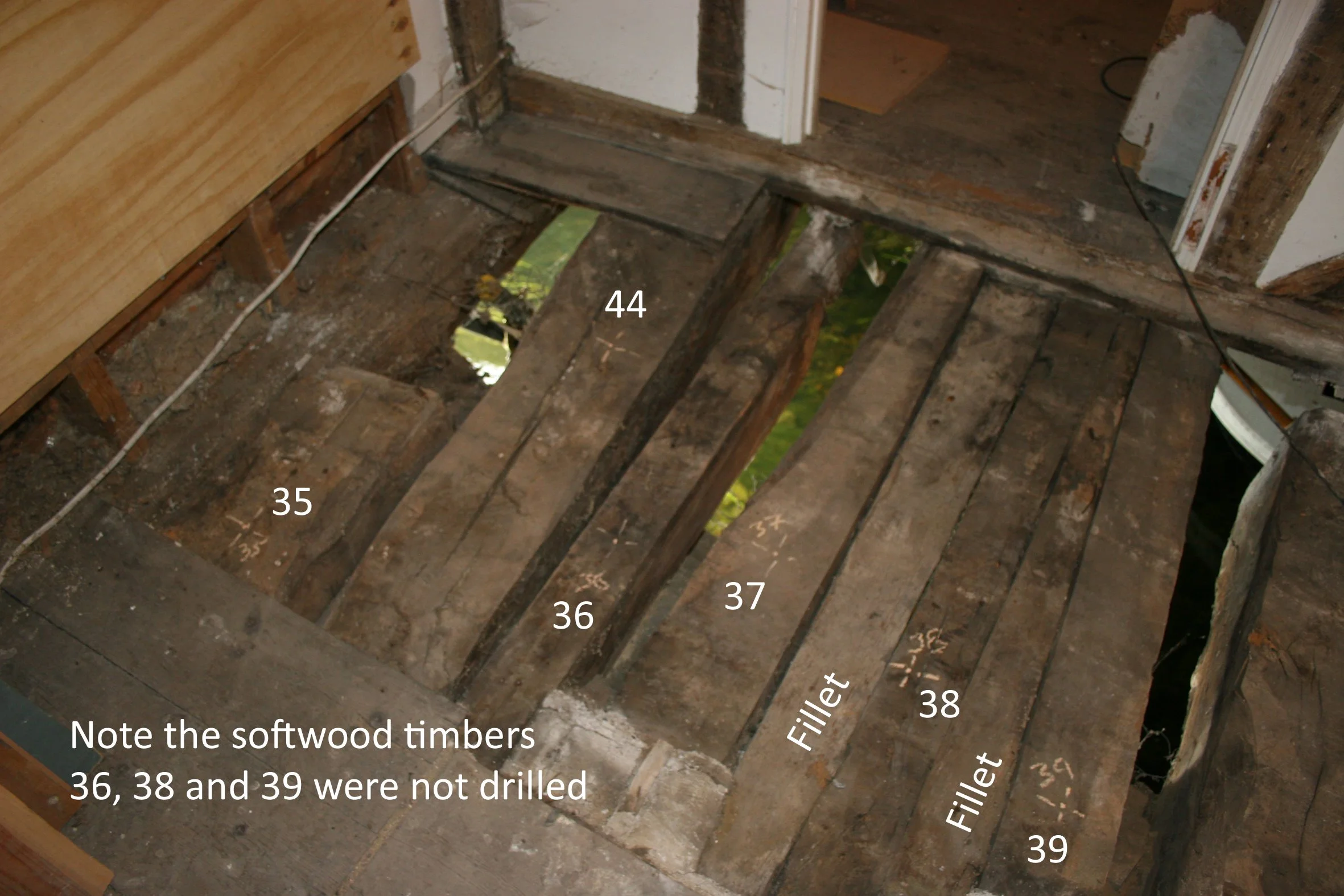 The timbers are tested with a Sibert Decay Detecting Drill to a depth of 200mm. This is a large scientific instrument whose operation can be limited by the site of the proposed drilling. Where practical, each timber is drilled twice at about 100mm from their exposed ends and again near their centres. Efforts are made to avoid mortices, nails, nail holes and any evident shakes. The timbers that are visibly rotted are not tested.