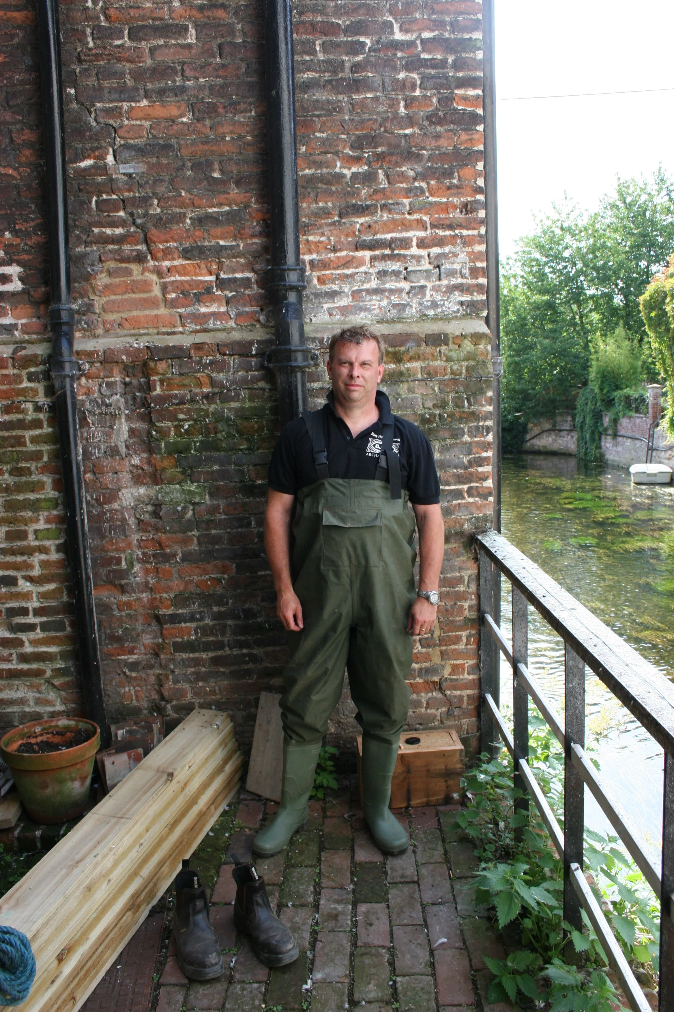 Decay testing Eastbridge Hospital Canterbury Bridge Floor. This was tested by drilling into the under-side of the timbers by standing in the river.